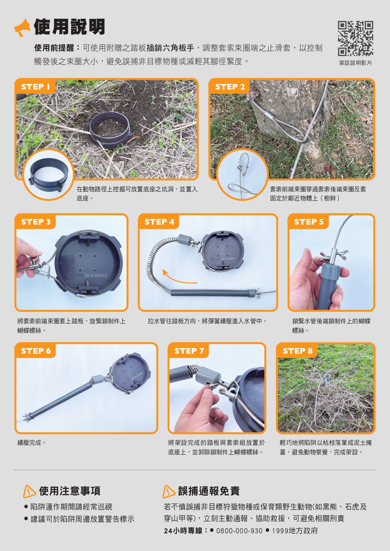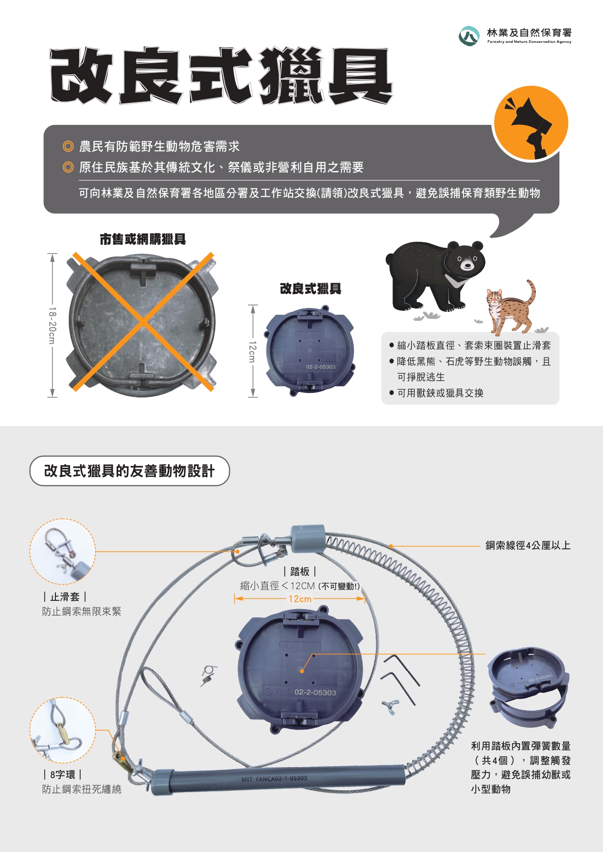 農業部林業及自然保育署為減少傳統陷阱獵具(山豬吊)誤捕非目標之野生動物,備有改良式獵具予需求民眾申領使用,詳如以下說明及附件: