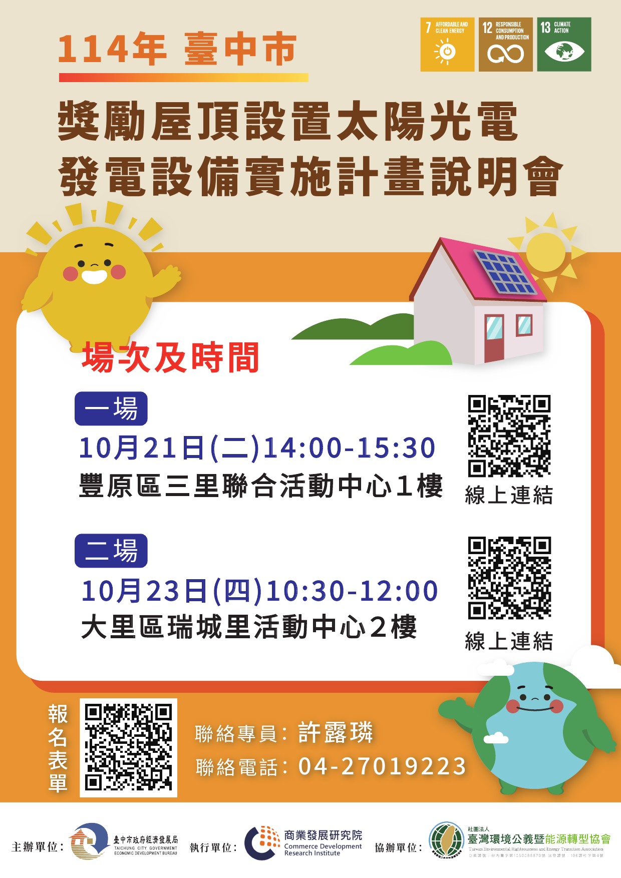 臺中市政府經濟發展局訂於114年10月21日(豐原區)、10月23日(大里區),辦理「獎勵屋頂設置太陽光電發電設備實施計畫說明會」,歡迎鄉親踴躍報名參加!