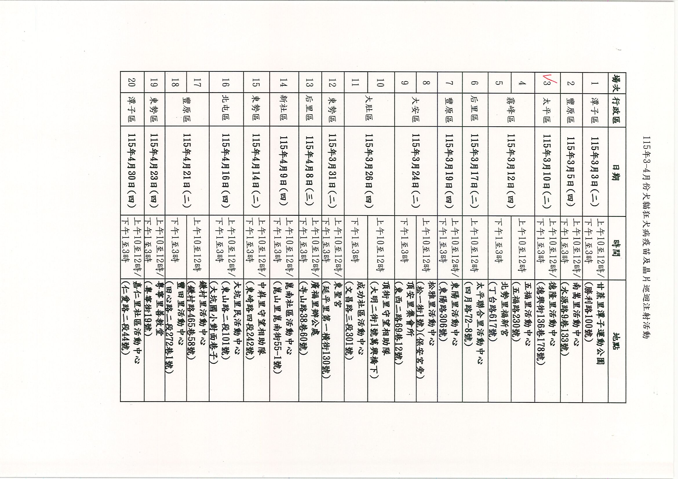 轉知:臺中市動物保護防疫處辦理「115年3~4月犬貓狂犬病疫苗及晶片巡迴注射活動」行程表及宣導單各1份。