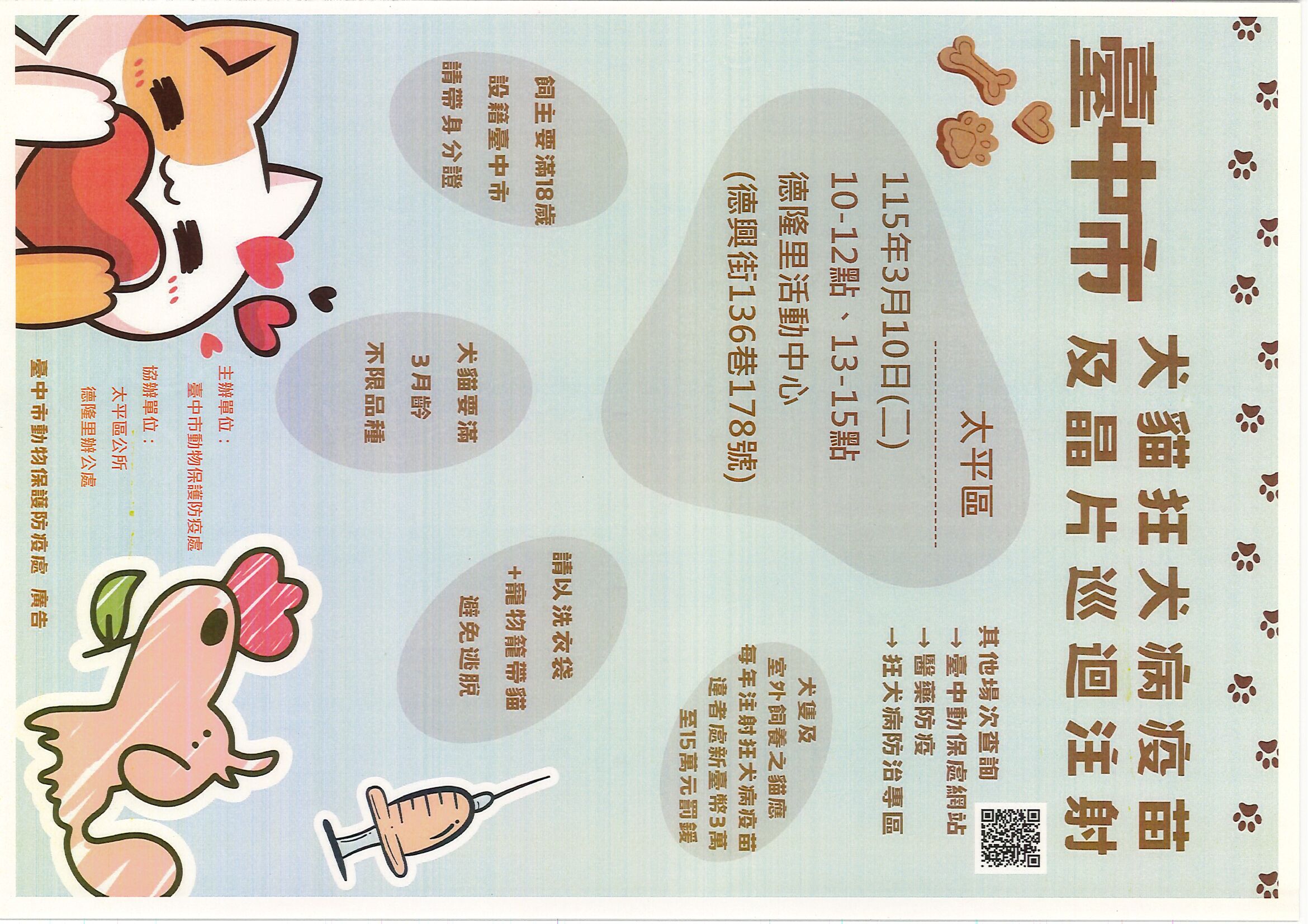 🎊臺中市動物保護防疫處115年3~4月犬貓狂犬病疫苗及晶片巡迴注射活動🎊