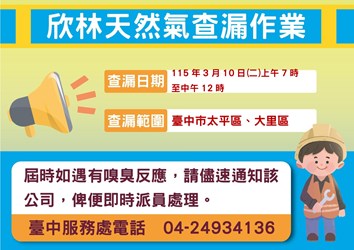 欣林天然氣有限公司訂於115年3月10日(星期二)上午7時至12時假太平區、大里區實施查漏作業!