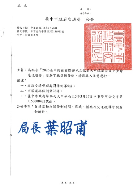 【轉知】2026臺中媽祖國際觀光文化節大甲鎮瀾宮天上聖母遶境進香(起駕及回鑾)活動」交通管制公告。